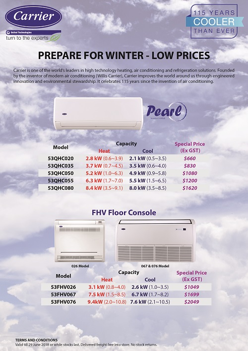 SPECIALS UNTIL 31 AUGUST. CARRIER PEARL HI WALL UNITS ARE CLEARANCE MODELS AND AVAILABLE WHILE STOCKS LAST